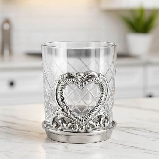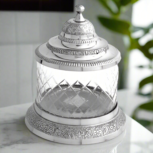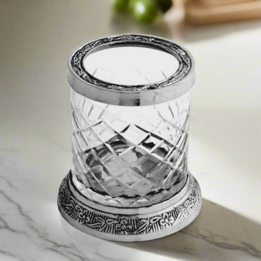 Silver 5"H Fleur De Lis Emblem on Etched Glass Jar with Lid, Bathroom Mouthwash Glass. Set of 2