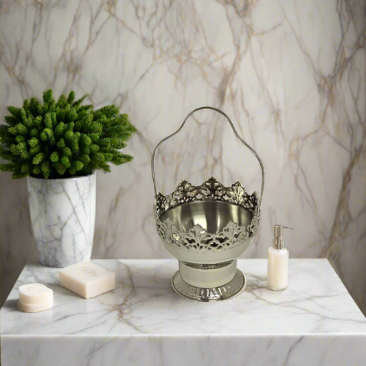 Silver 7" Diameter Floral Basket. Folding Handle. Victorian Design Centerpiece