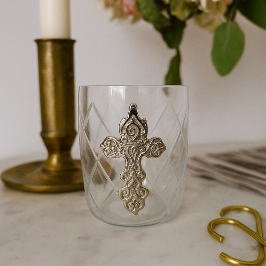 Silver Cross On Glass Votive Candle Holder. - Set of 3