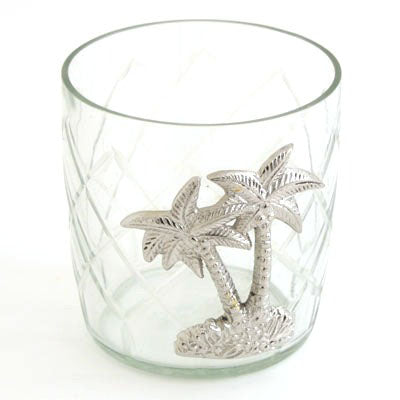Nickel palm tree on glass votive holder. Glass measures 3"H. The price is for three.