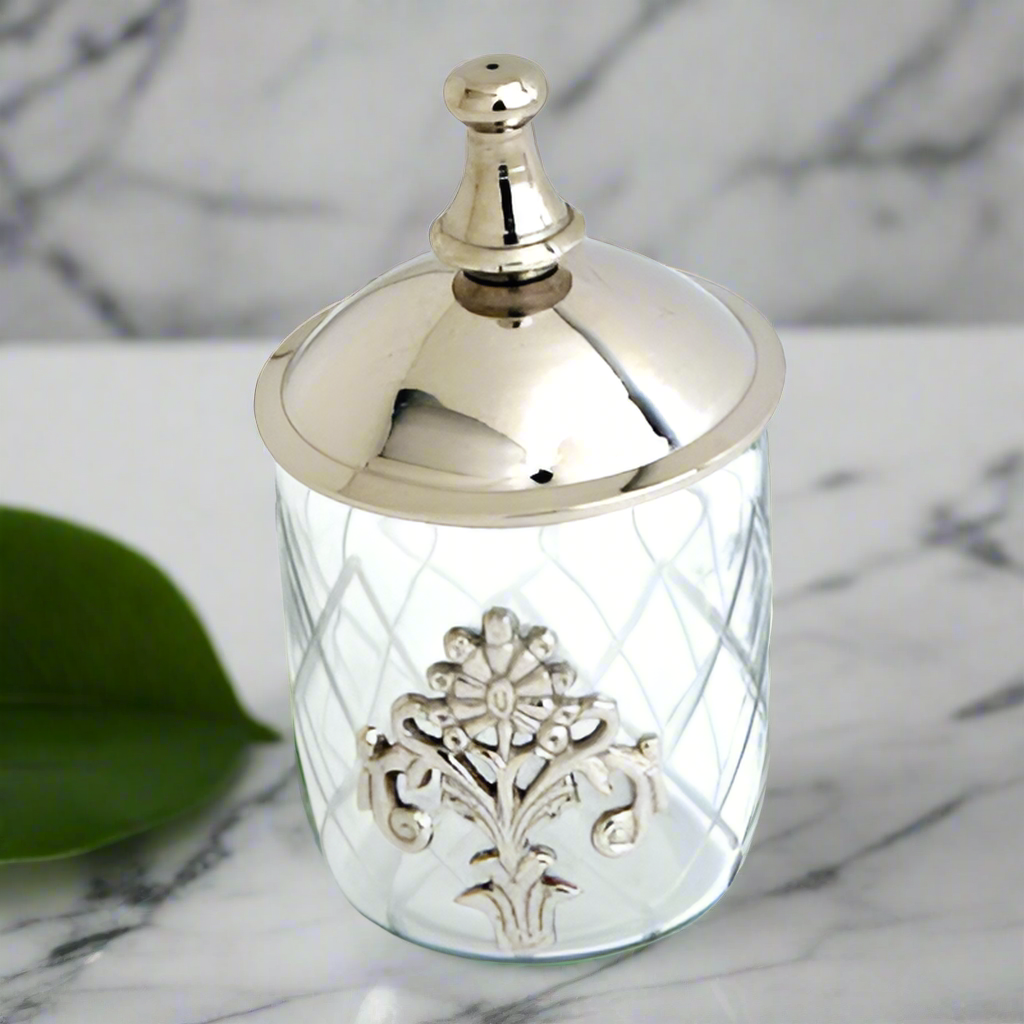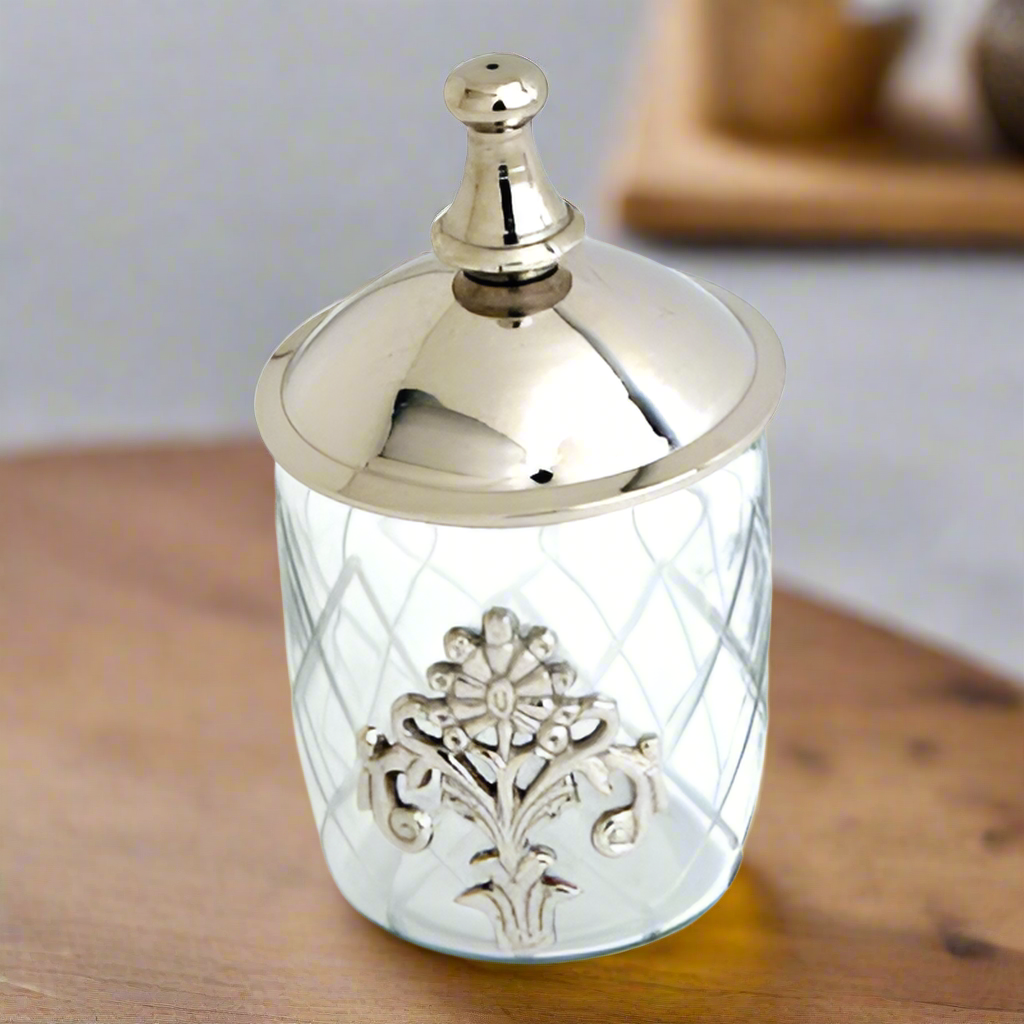 Achieve luxurious presentation with these elegant 3" clear glass jars and nickel-plated toppers. Whether you’re using them to showcase homemade jams or as chic candle holders, this set of two jars with their cordial lids will make a tasteful addition to any space.