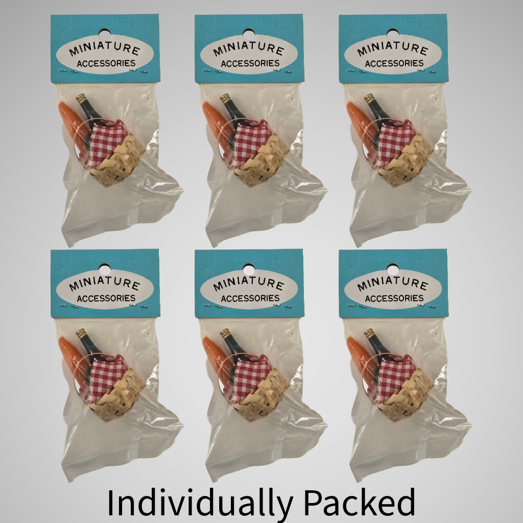 Bring a touch of French countryside charm to your dollhouse with this Set of 6 Miniature Baskets with Wine and Baguette. Each tiny basket features a detailed bottle of wine and a freshly baked baguette, beautifully scaled at 1:12 to fit perfectly into any miniature kitchen, bakery, or picnic scene.